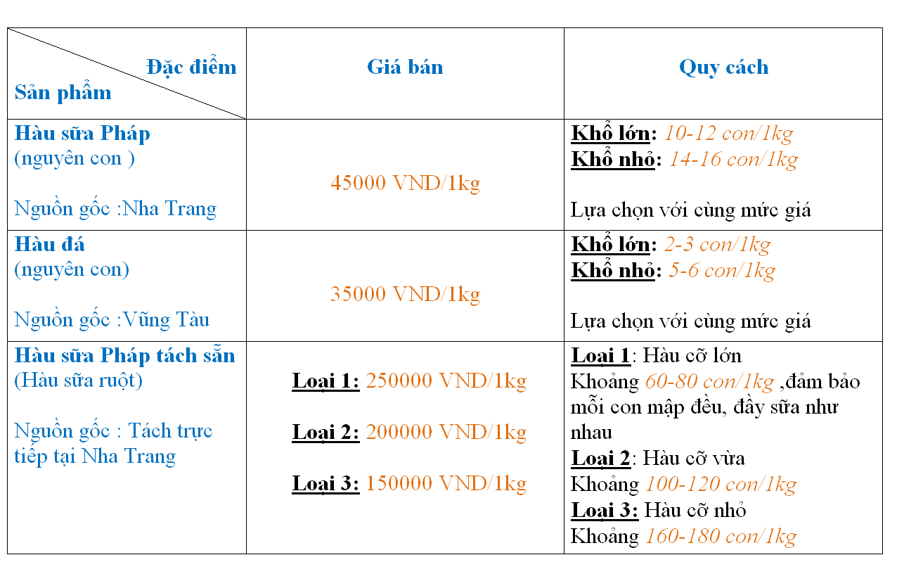 Ngoài ra, bạn cũng có thể mua hàu nguyên con tươi sống với giá chỉ từ 35.000 đến 50.000 VNĐ/kg. Những món chế biến như hàu nướng phô mai hay ăn sashimi từ hàu cũng rất được yêu thích. Đừng quên liên hệ nếu bạn cần số lượng lớn để nhận báo giá ưu đãi nhất nhé!