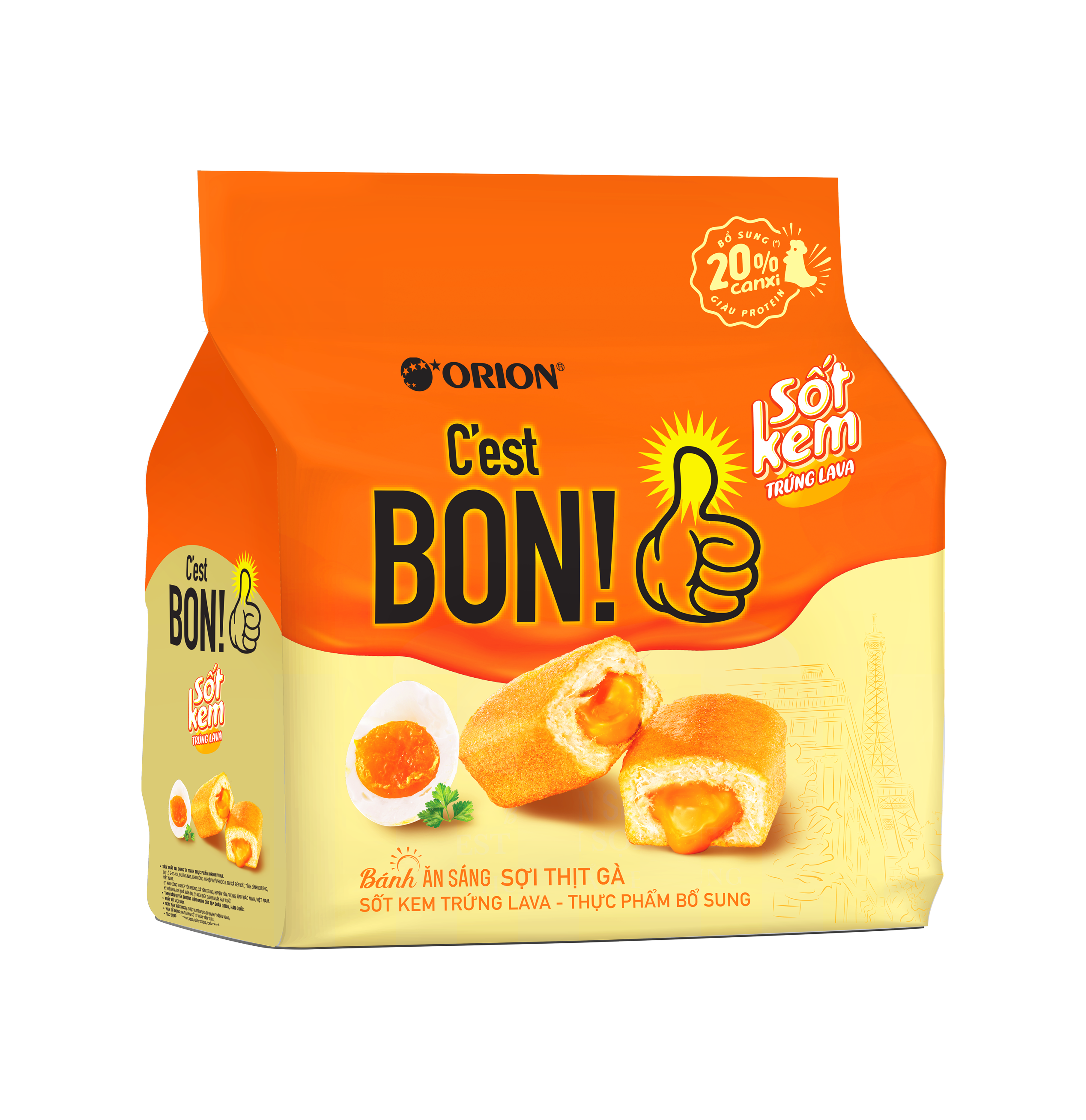 Mỗi gói bánh bông lan C’est Bon Orion 85g chứa thành phần chính gồm trứng, bột mì, đường và chà bông gà, đảm bảo mang lại giá trị dinh dưỡng cao. Chà bông gà được ướp kỹ, làm nên vị mặn mà quyến rũ, hài hòa với độ ngọt nhẹ từ bánh. Bánh bông lan không chỉ hấp dẫn về sắc màu mà còn gây ấn tượng bởi kết cấu mềm mịn và hương thơm lôi cuốn.