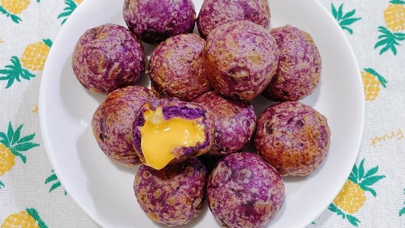 Để chế biến bánh, trước tiên, bạn cần gọt vỏ, rửa sạch và cắt khoai mỡ thành từng miếng nhỏ. Sau đó, trộn khoai với bột năng, bột nếp, đường và một ít muối. Khi hỗn hợp đã đều, vo thành viên tròn và chiên vàng giòn. Món bánh khi hoàn thành sẽ có lớp vỏ giòn rụm bên ngoài, còn bên trong thì mềm thơm, hòa quyện cùng vị phô mai béo ngậy.