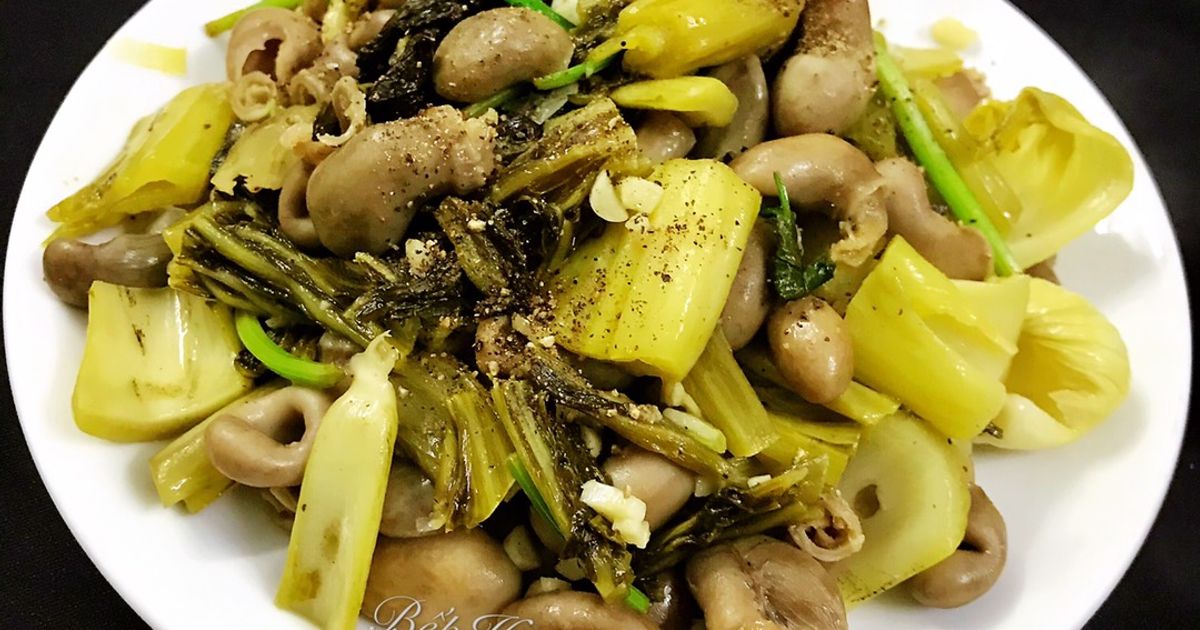 Tiếp tục cho cải chua vào xào sơ qua, sau đó kết hợp cả bao tử cá vào chảo, thêm một muỗng canh nước mắm, một ít giấm và đường để làm dịu vị chua của cải. Xào đều tay cho đến khi mọi nguyên liệu quyện lại với nhau. Cuối cùng, rắc hành lá cắt nhỏ lên trên và thưởng thức món ăn nóng hổi. Chắc chắn món này sẽ khiến cả nhà bạn mê mẩn cho mà xem!