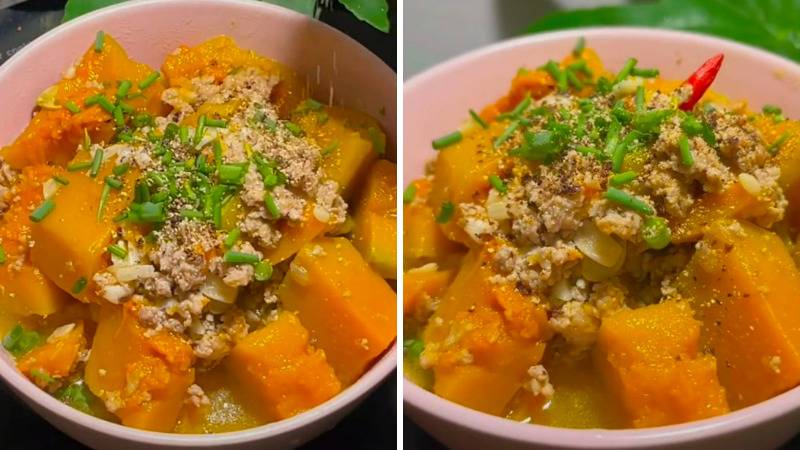 Cuối cùng, cho bí đỏ vào nồi cùng với một ít nước, đun nhỏ lửa cho đến khi bí mềm. Bí đỏ sẽ hòa quyện cùng vị ngọt của thịt, tạo nên một món ăn có hương vị độc đáo. Món bí đỏ hầm thịt băm này không chỉ ngon miệng mà còn ấm áp, là lựa chọn lý tưởng cho những ngày thời tiết se lạnh.