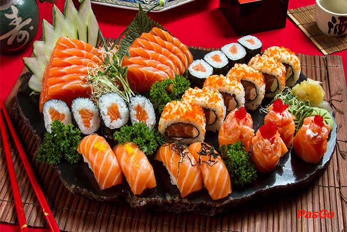 Một trong những điểm nhấn tại đây là sashimi cá hồi Na Uy được thái lát dày, đảm bảo độ tươi ngon, chất lượng tuyệt hảo. Ngoài món sashimi, giá trị buffet ở đây còn được nâng cao nhờ sự đa dạng với hơn 50 món chính, từ sushi cho đến các món ăn kèm phong phú.