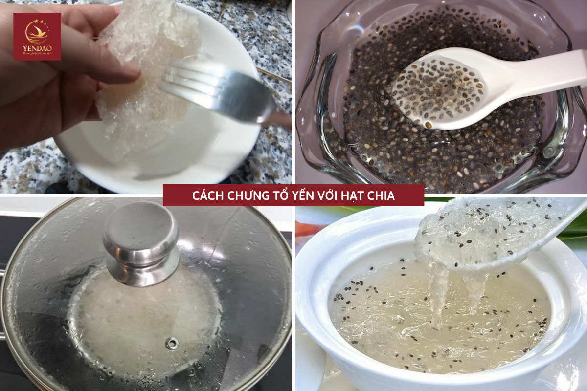 Cách chưng rất đơn giản. Bạn chuẩn bị khoảng 5-10g tổ yến, 5-10 quả táo đỏ, 1-2 thìa cà phê hạt chia và một ít đường phèn. Sau khi ngâm yến và táo, chưng tất cả các nguyên liệu này trong vòng 10 phút. Khi nước sôi, thêm hạt chia vào là bạn đã có một món ăn tuyệt vời.