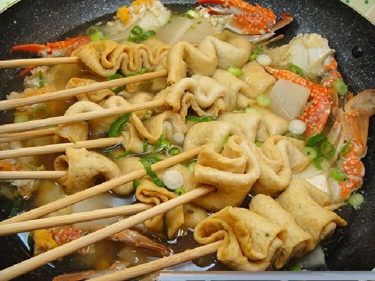 Chả cá xiên thường có hình dáng bẹt, được cuộn tròn trên que tre và có thể chế biến thành nhiều món ăn khác nhau. Bạn có thể chiên giòn hoặc hầm cùng nước súp nóng, tùy theo sở thích. Món ăn này thường được ăn kèm với nước súp thanh ngọt hoặc nước súp hơi cay, tạo nên sự hòa quyện hoàn hảo.