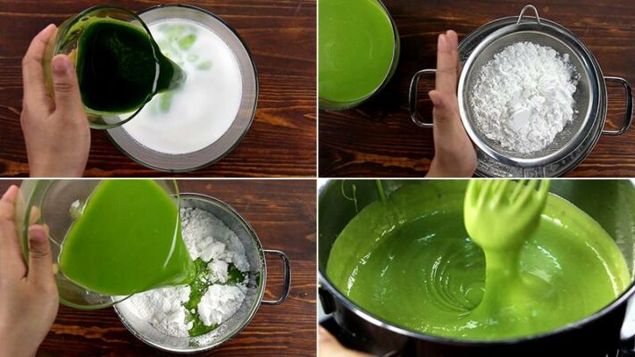 Tiếp theo, bạn đun nước lá dứa bằng cách xay 100g lá dứa với 700ml nước, sau đó lọc qua rây để lấy nước cốt. Hòa nước cốt dừa cùng hỗn hợp bột, khuấy đều cho đến khi tan hoàn toàn. Đừng quên cho thêm một muỗng canh dầu ăn giúp bánh trở nên mềm mịn hơn.