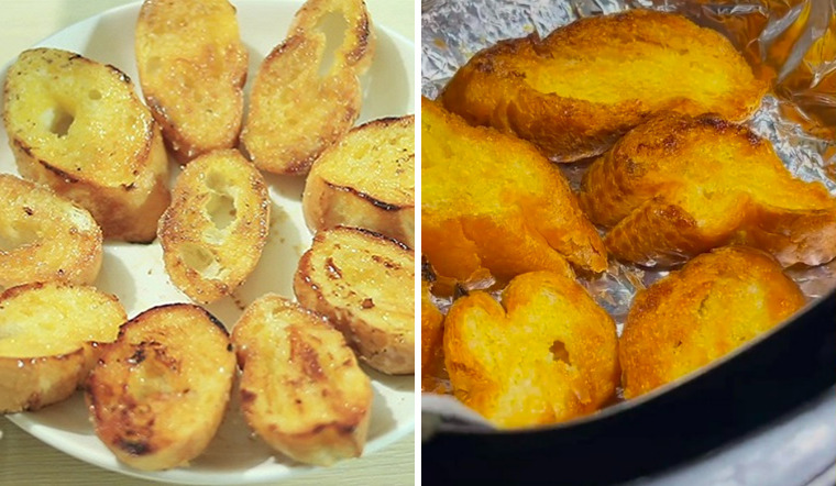 Tiếp theo, cắt bánh mì thành những miếng nhỏ vừa ăn, hình vuông sẽ giúp bánh nhanh chín và giòn rụm hơn. Để nướng bánh, bạn có thể sử dụng lò nướng, bếp than hoặc nồi chiên không dầu. Nếu dùng chảo, hãy để mặt thấm bơ đường úp xuống trước và chiên cho vàng đều, sau đó mới trở mặt còn lại.