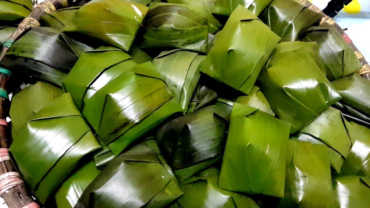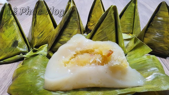 Khi mọi thứ đã sẵn sàng, bạn chia bột thành từng phần nhỏ và cán dẹp. Sau đó, cho nhân đậu xanh hoặc thịt vào giữa, nặn tròn và giữ cho bánh không bị rơi ra ngoài. Mỗi bánh sẽ được gói bằng lá chuối, bắt đầu bằng cách gập hai mép lá lại với nhau, tạo thành hình chóp ở phía trước. Cuối cùng, gập ngược hai đầu lá xuống dưới để bánh được chắc chắn.