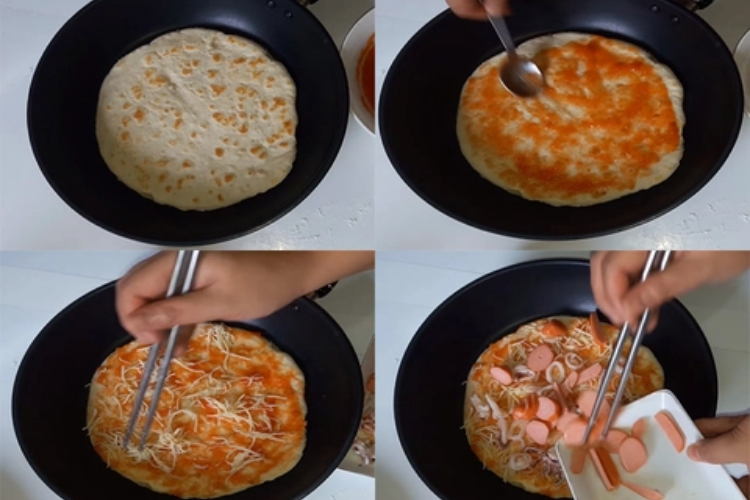 Để thêm phần hấp dẫn, đừng quên thêm lớp xúc xích cắt lát và phô mai mozzarella lên trên cùng. Sau khi hoàn tất, bạn có thể nướng pizza bằng chảo. Phết một ít dầu ăn lên chảo, đặt đế bánh vào và nướng đến khi vàng đều hai mặt. Chỉ trong khoảng 10 phút, bạn đã có một chiếc pizza thơm ngon, nóng hổi để thưởng thức cùng gia đình và bạn bè!