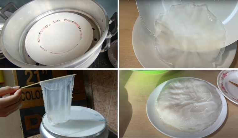 Khi đã có hỗn hợp bột sẵn sàng, hãy cho nước vào nồi hấp. Khi nước sôi, đặt dĩa bánh tráng lên và đậy nắp lại, hấp trong khoảng 1 phút. Sau đó, bạn có thể lấy dĩa bánh tráng ra và cho vào đó những nguyên liệu yêu thích như chả lụa, rau sống, hành phi để tạo nên hương vị hấp dẫn.
