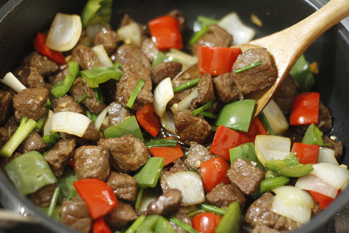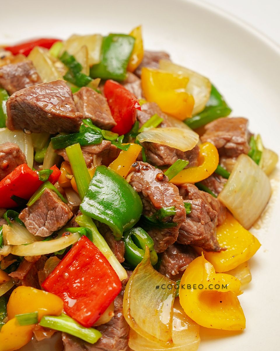 Cuối cùng, bạn chỉ cần chiên thịt bò trên lửa lớn. Đừng quên thường xuyên lắc chảo để thịt chín đều, bên ngoài xém vàng còn bên trong vẫn giữ được độ mềm. Khi món ăn đã hoàn tất, đừng quên thêm một ít hành lá và thưởng thức cùng cơm nóng hoặc bánh mì nhé!