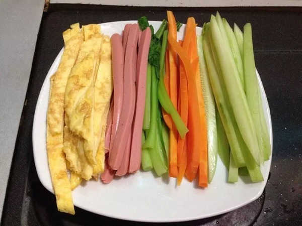 Tiếp theo, bạn hãy chuẩn bị các nguyên liệu khác như củ cải muối, dưa chuột và cà rốt. Cà rốt cần được cắt thành sợi dài và dưa chuột cũng vậy, nhớ bỏ hạt để dễ cuộn. Một bước quan trọng nữa là đánh trứng và chiên trên chảo để làm thành những miếng trứng nhỏ, sợi dễ cuộn.