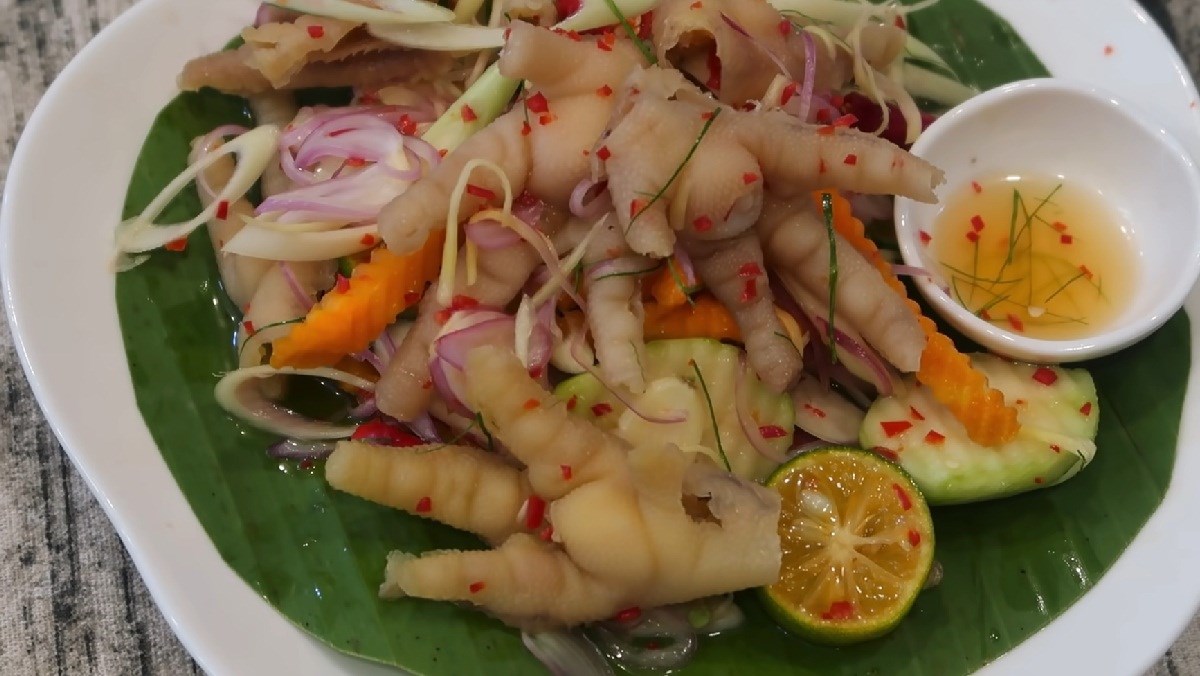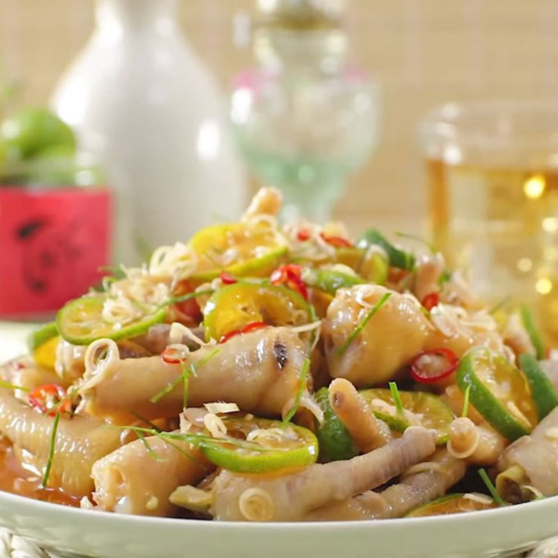 Chân gà rút xương ngâm sả tắc xoài là một món ăn ngon miệng và rất thích hợp cho những buổi tiệc tùng hay cuối tuần cùng bạn bè, gia đình. Để làm món này, trước tiên, bạn cắt chân gà thành các miếng vừa ăn, rồi cho vào một cái tô lớn cùng với cà rốt, xoài non, tắc, sả bào, gừng cắt sợi và một ít tỏi. Sự kết hợp của các nguyên liệu sẽ tạo nên hương vị chua ngọt nhẹ nhàng, cùng với một chút cay cay làm món ăn trở nên hấp dẫn hơn.