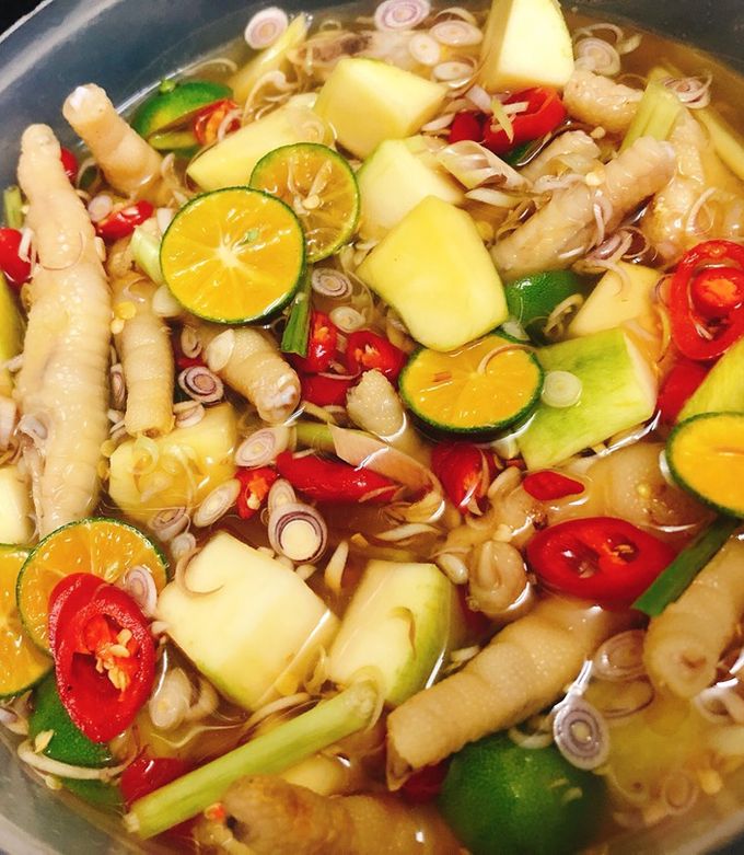 Sau khi đã chuẩn bị nguyên liệu, đun sôi 1 lít nước, sau đó cho vào nồi hỗn hợp gia vị bao gồm 6 muỗng canh nước mắm, 6 muỗng canh đường, 6 muỗng canh giấm gạo. Khi hỗn hợp nước mắm đã nguội, bạn cho sả, ớt, tắc cùng chân gà và xoài vào. Đảm bảo chân gà được ngâm ngập trong hỗn hợp này.