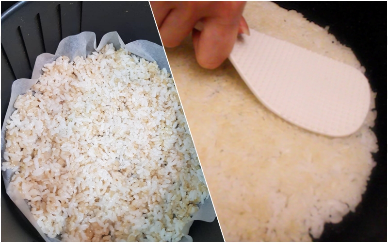 Khi cơm đã nguội hoàn toàn, ép chúng thành từng miếng mỏng vừa ăn. Đừng quên làm nóng nồi chiên không dầu ở nhiệt độ 180°C trong khoảng 6-7 phút để đảm bảo cơm cháy sẽ giòn rụm. Lót giấy nến dưới đáy nồi, quét dầu đều rồi xếp những miếng cơm đã ép vào.