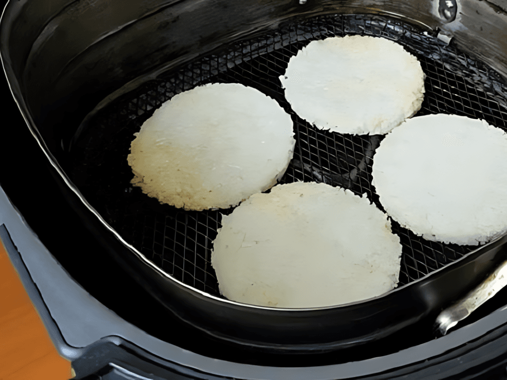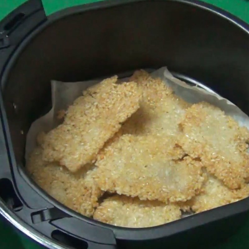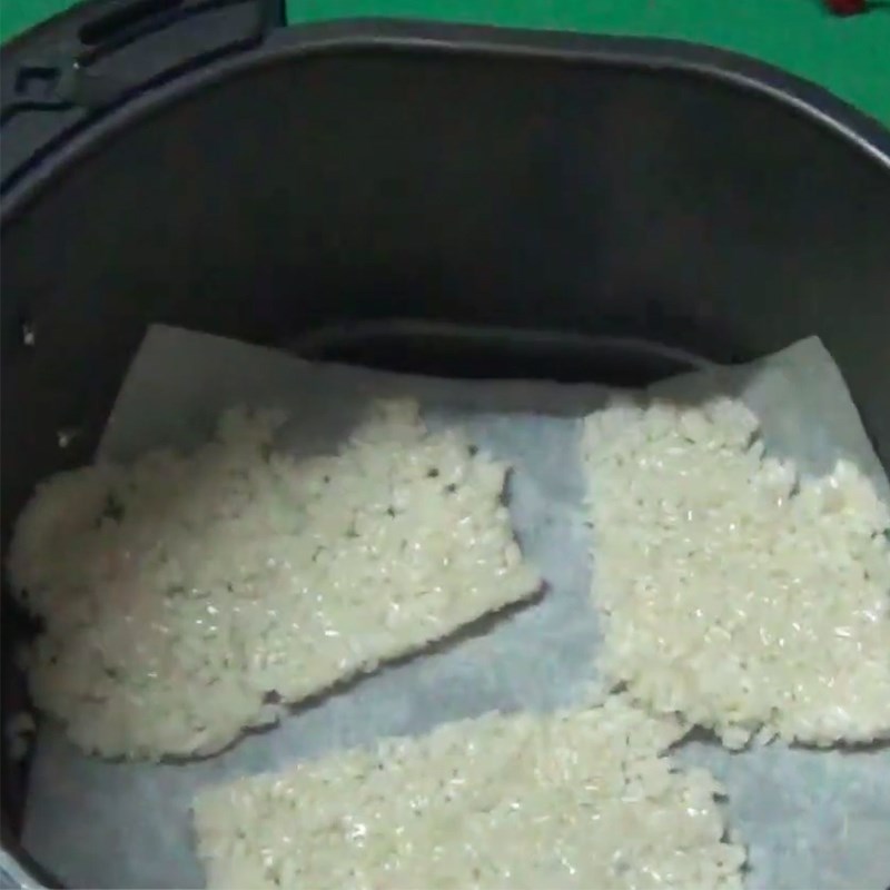 Khi nồi đã nóng, hãy xếp từng miếng cơm đã ép mỏng lên khay, lót giấy nến và phết nhẹ một lớp dầu ăn lên bề mặt. Chiên cơm ở nhiệt độ 170 độ C trong khoảng 12 phút. Sau khi hết thời gian, bạn hãy mở nồi và lật mặt cơm, quét một lớp dầu mỏng nữa rồi tiếp tục chiên thêm 10 phút nữa.