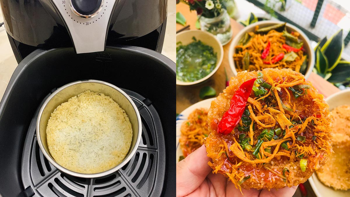 Khi mọi thứ đã sẵn sàng, hãy làm nóng nồi chiên không dầu ở nhiệt độ 170 độ C trong khoảng 5 phút. Sau đó, cho khay cơm vào và chiên trong 12 phút. Sau khi hết thời gian, nhớ trở mặt cơm, quét một lớp dầu ăn lên và tiếp tục chiên thêm ít phút để có màu vàng đẹp.
