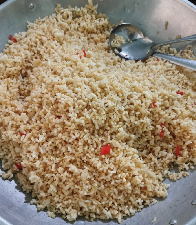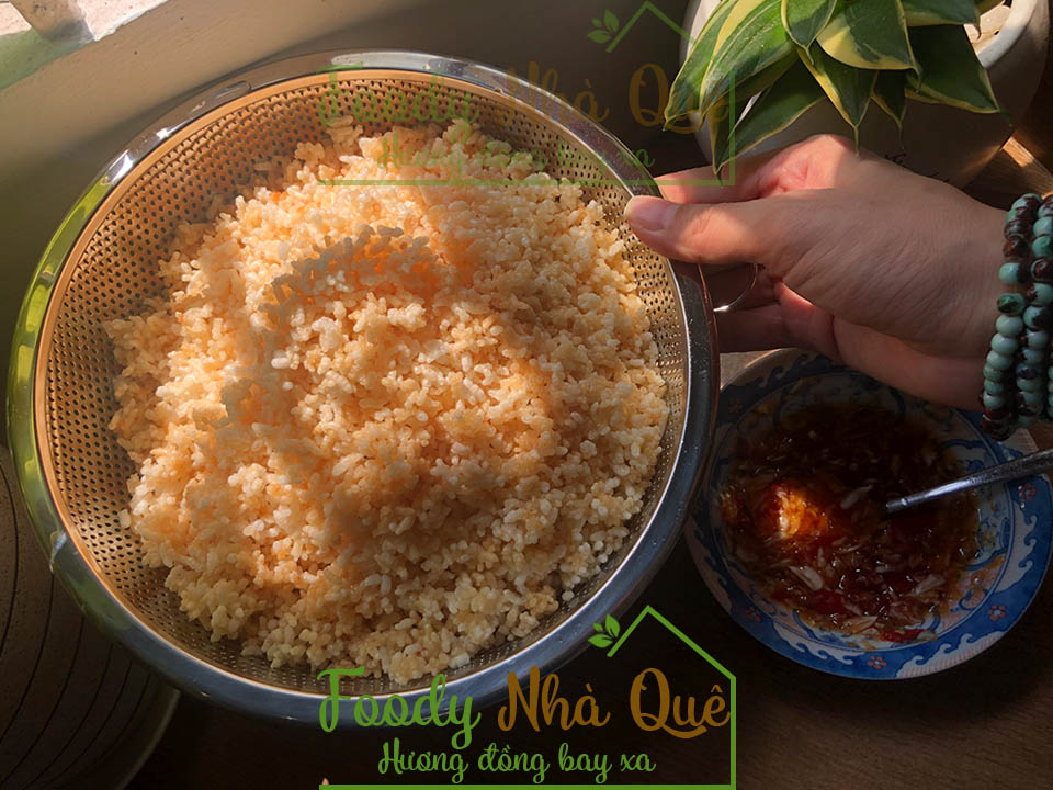 Khi cơm đã vàng, bạn hãy rưới hỗn hợp nước mắm lên và đảo đều tay cho cơm thấm đều gia vị. Món ăn này không chỉ là món ăn vặt thú vị mà còn gợi nhớ những kỷ niệm đẹp về quê hương, nơi mà từng hạt cơm đều mang một câu chuyện riêng.