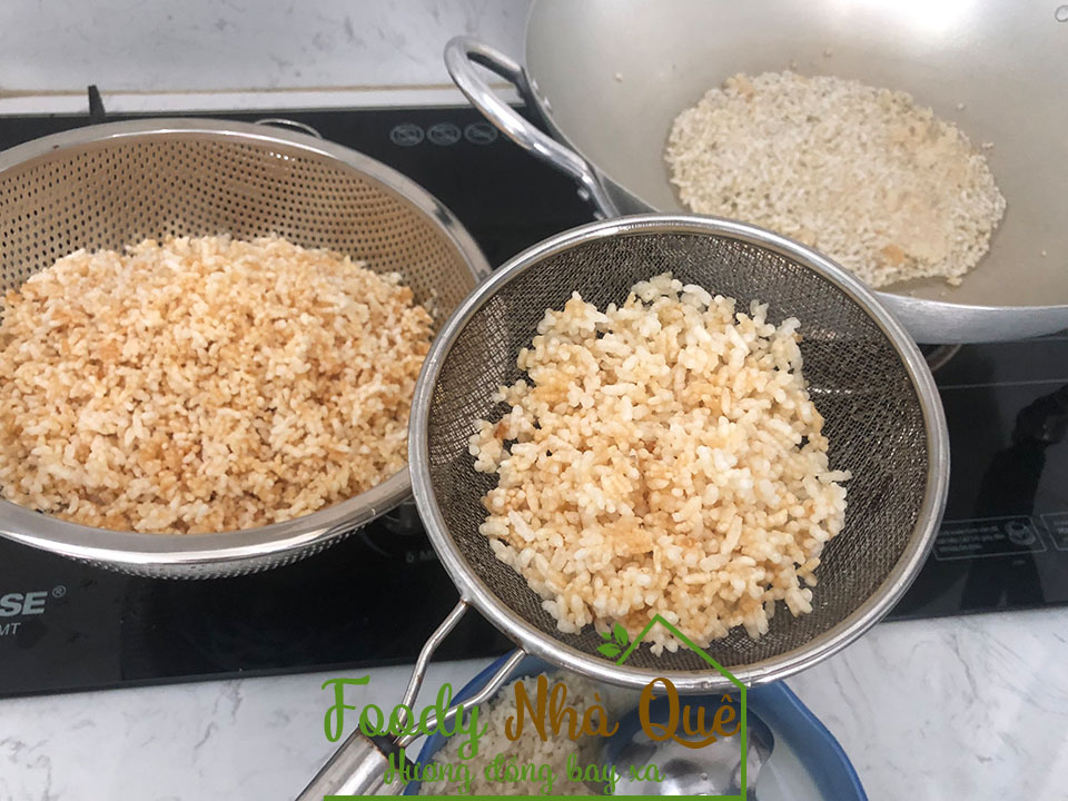 Đầu tiên, bạn hãy lấy cơm phơi khô ra, đập cho rời hạt và rây bỏ phần vụn bột. Tiếp theo, bắc chảo lên bếp và cho dầu vào. Khi dầu nóng già, cho từng nắm cơm khô vào chiên. Rang ở lửa vừa khoảng 8 phút đến khi hạt cơm hơi ngả vàng thì hãy giảm lửa xuống.