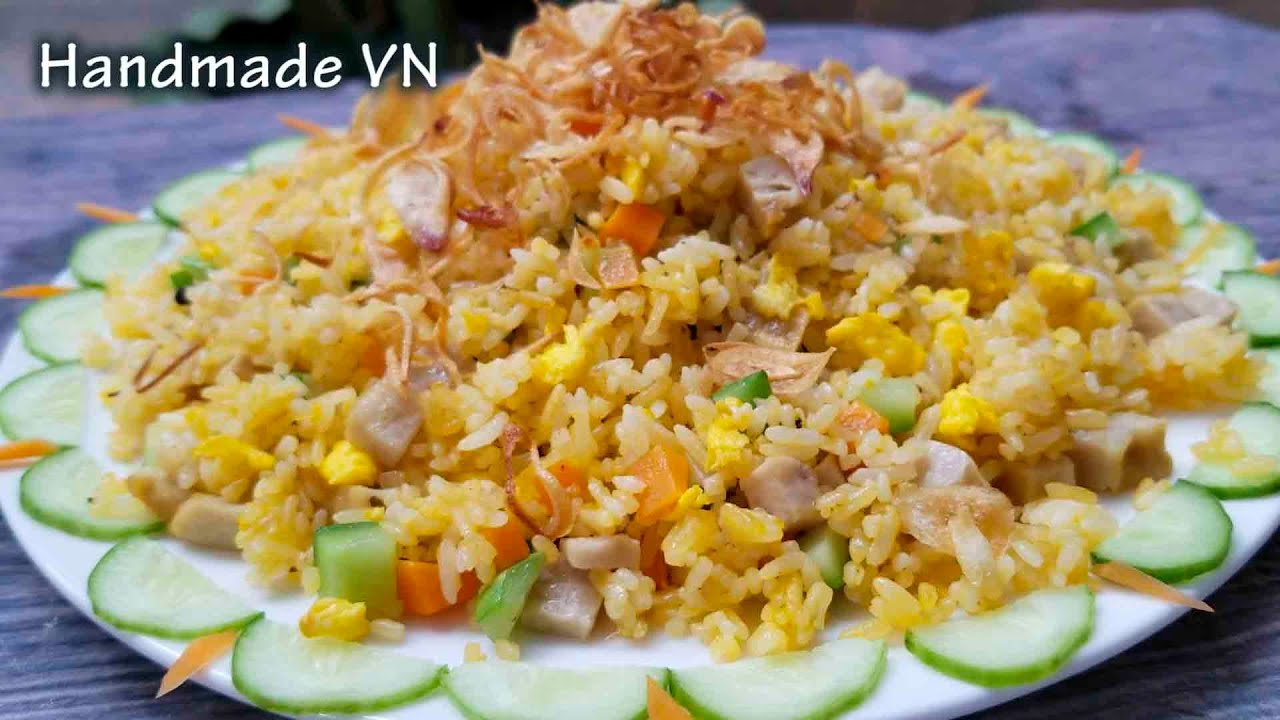 Khi chế biến, trộn cơm với hai lòng trắng trứng trước. Lòng trắng trứng không chỉ giúp hạt cơm được tơi ra mà còn tạo độ mềm, không bị khô. Khi cho cơm vào chảo, cần sử dụng hai muỗng canh dầu ăn, chờ đến khi dầu nóng mới cho cơm vào. Lúc này, hãy đảo đều tay trên lửa lớn để hạt cơm không bị dính.