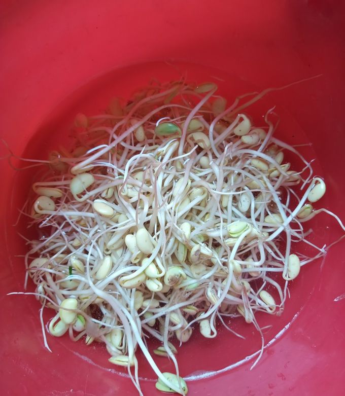 Khi đã ngâm đủ thời gian, bạn vớt đậu ra và cho vào một chiếc khay hoặc vỏ hộp sữa đã chuẩn bị sẵn. Đừng quên là bạn có thể làm điều này mà không cần tưới nước, bởi vì nhờ vào độ ẩm tự nhiên, giá đậu sẽ phát triển khỏe mạnh. Bây giờ, hãy đậy nắp lại và để nơi thoáng mát để kích thích quá trình nảy mầm.