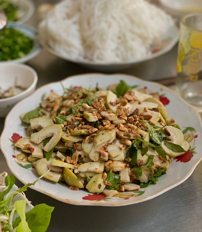 Gỏi trái vả là món ăn độc đáo và hấp dẫn của xứ Huế, mang trong mình hương vị tươi ngon của vùng đất cố đô. Để chuẩn bị món gỏi này, bạn bắt đầu bằng việc sơ chế trái vả. Đun sôi một nồi nước, cho trái vả vào luộc chín tới rồi vớt ra thả ngay vào nước lạnh để giữ độ giòn. Thành phẩm sẽ là những miếng vả xanh tươi, mềm mại, hòa quyện với những nguyên liệu khác.