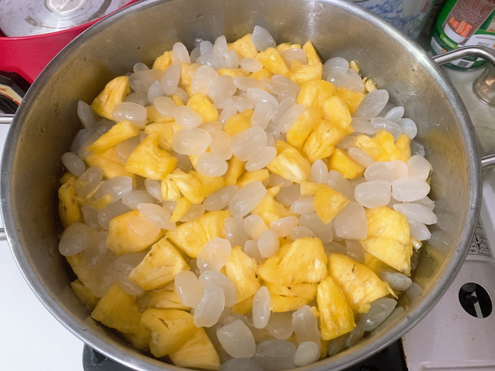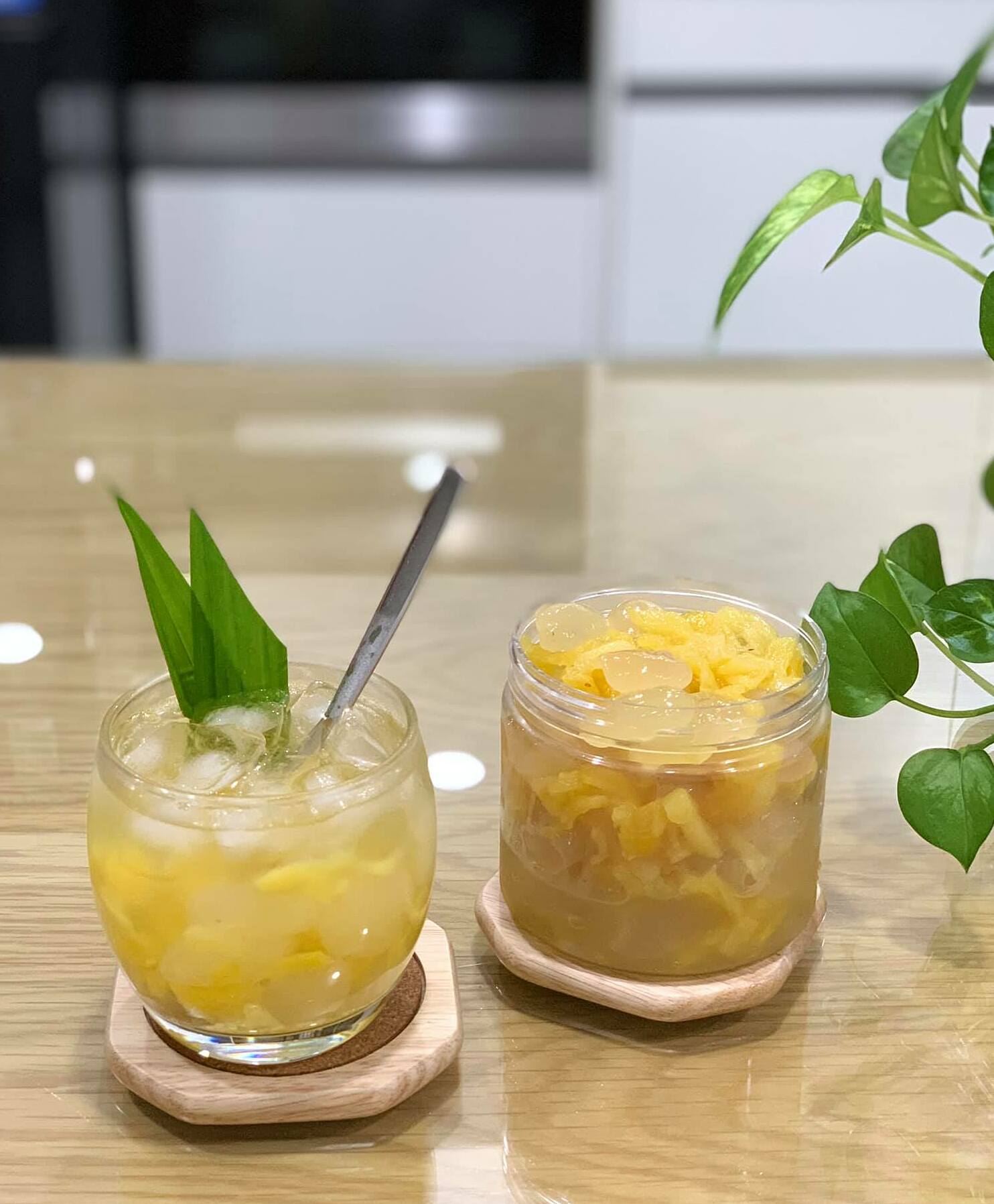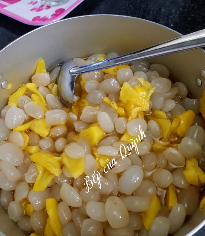 Tiếp theo, bạn cho hạt đác vào nồi nước sôi và nấu trong khoảng 3 phút, sau đó vớt ra rửa lại với nước mát cho sạch nhớt. Để hạt đác thêm ngọt ngào, bạn có thể cho vào chảo cùng với mít, đường, gừng và thơm. Trộn đều hỗn hợp này và để yên khoảng 30 phút để đường tan ra.