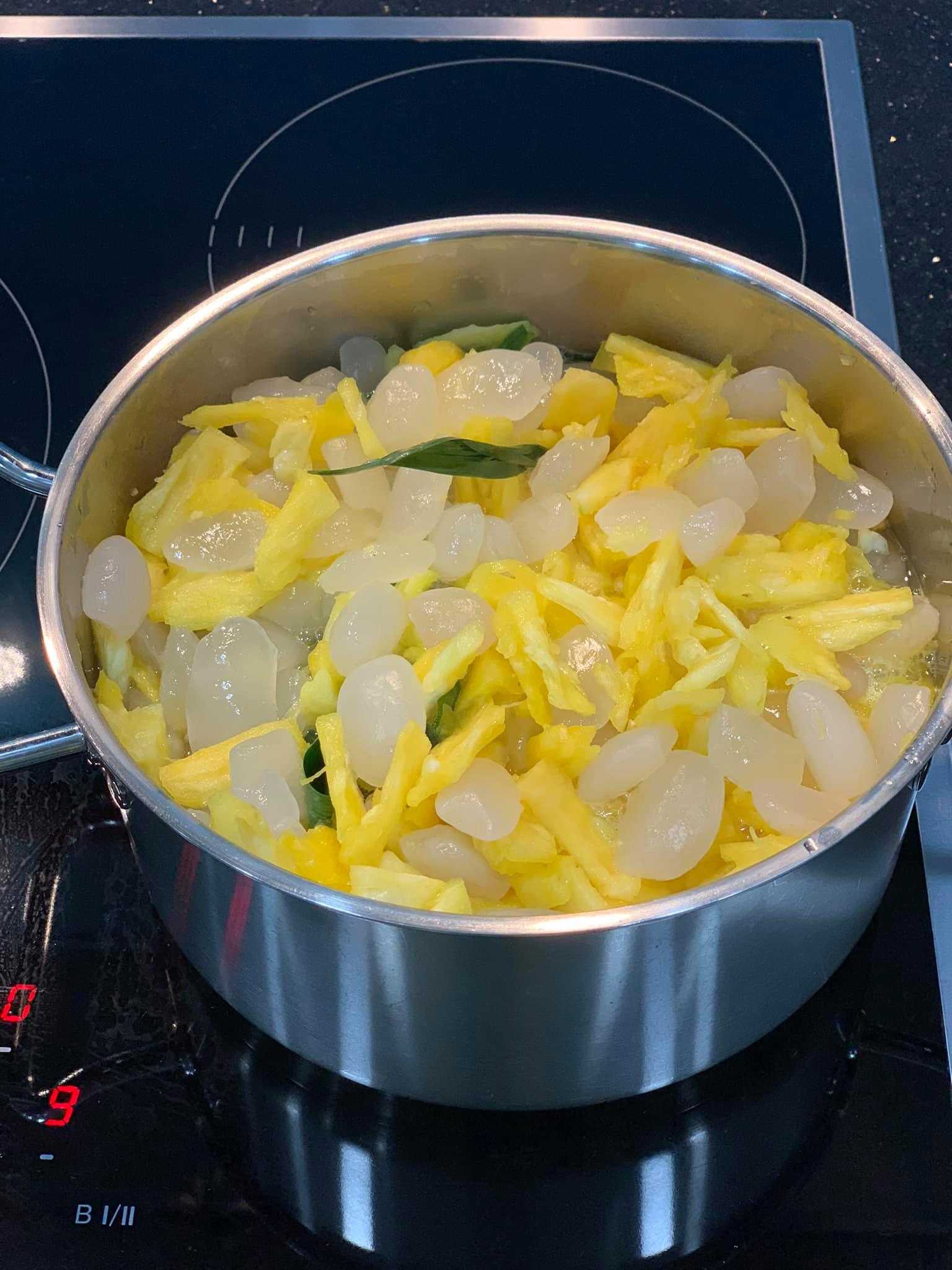 Đầu tiên, bạn nên rửa sạch hạt đác và luộc chúng trong nước sôi khoảng 10 phút để loại bỏ nhớt. Sau đó, cắt dứa thành từng miếng nhỏ và cho vào chảo cùng với đường và một chút muối. Đợi cho dứa tiết ra nước, sau đó cho hạt đác vào và rim đều tay để các nguyên liệu thấm đều gia vị.