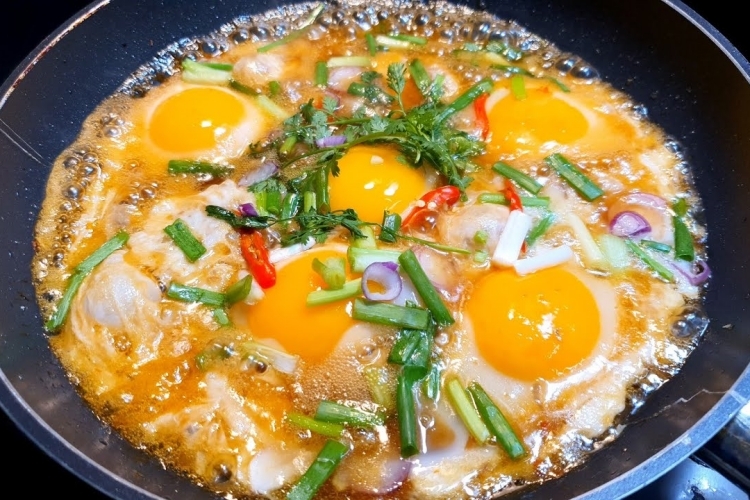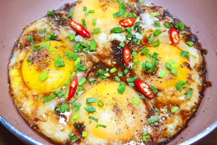 Sau khi hành dậy mùi, bạn cho nước mắm vào chảo, thêm một chút tỏi phi, rồi nhớ khuấy đều để gia vị hoà quyện với nhau. Tiếp theo, chiên trứng gà, có thể dùng trứng vịt nếu bạn thích. Trứng kho cần phải thật chín tới, khi thấy nước kho sôi lăn tăn, bạn hãy đậy nắp lại và để lửa nhỏ liu riu cho trứng thấm gia vị.