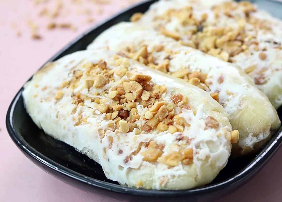 Cuối cùng, cho chuối và đậu phộng vào hỗn hợp nước cốt dừa đã được chuẩn bị. Đổ hỗn hợp này vào khuôn or túi nilon, để trong ngăn đông tủ lạnh cho kem đông lại. Khi bạn lấy kem ra, sẽ cảm nhận được vị béo ngậy của nước cốt dừa, hòa quyện cùng vị ngọt tự nhiên của chuối. Thật tuyệt vời cho những ngày hè, phải không nào?