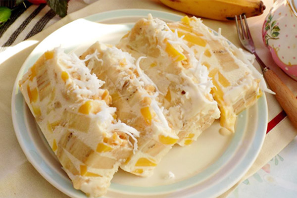 Tiếp theo, cho vào máy xay 1 trái chuối, 3 múi mít đã cắt, 2 hộp sữa chua có đường, xay nhuyễn khoảng 2-3 phút. Sau đó, bạn thêm hỗn hợp chuối nghiền vào nước cốt dừa đã chuẩn bị, trộn đều cho chuối thấm thật đều. Đừng quên đánh bông 250g kem tươi cùng với một chút đường để tạo độ béo ngậy.