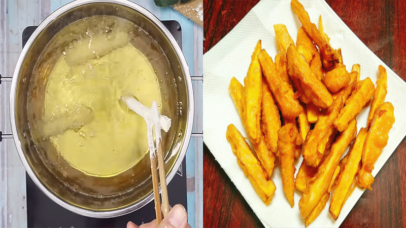 Đặc biệt, việc chiên hai lần giúp khoai không bị hút dầu, vẫn giữ được độ giòn lâu. Với bí quyết này, bạn có thể thưởng thức món khoai lang chiên giòn thơm ngon từ sáng tới trưa mà không lo bị mềm.