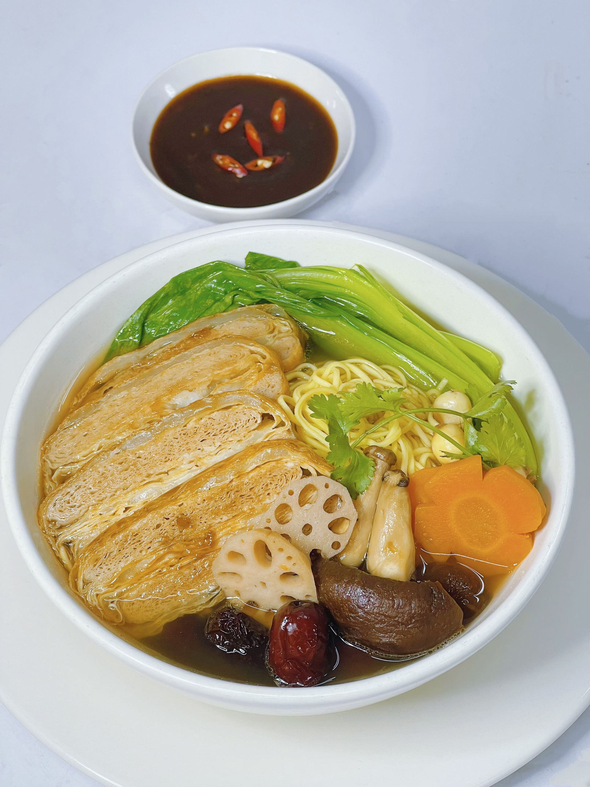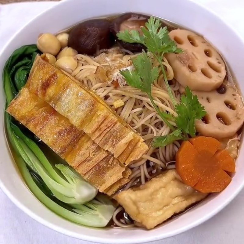 Khi đã hoàn thành nước dùng, bạn chỉ cần nấu mì sợi khoảng 200g và kết hợp với tàu hũ ki, đậu hũ chiên, củ sen và cải thìa. Món mì vịt tiềm chay không chỉ thơm ngon, mà còn mang đến cảm giác thanh đạm, dễ chịu cho người thưởng thức. Chính sự hòa quyện giữa các nguyên liệu sẽ mang lại cho bạn một bữa ăn đầy ấm áp và bổ dưỡng.