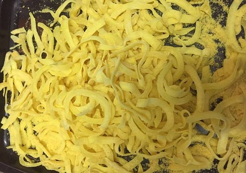 Khi dừa đã đủ thời gian ướp, bạn nên chuẩn bị phần màu tự nhiên bằng tinh bột nghệ. Cho dừa đã ướp vào tô, thêm 2 thìa tinh bột nghệ và 250g đường rồi trộn đều cho đến khi dừa ngấm màu vàng óng. Sau bước này, chuyển dừa vào chảo chống dính, vặn lửa vừa, đun cho nước đường sôi, sau đó hạ lửa nhỏ và thỉnh thoảng đảo đều để đường kết tinh.