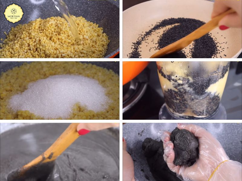 Sau khi đậu đã được nấu chín, bạn xay nhuyễn đậu đen rồi trộn với mè đen đã rang, thêm 100g đường và 30g mạch nha. Đun hỗn hợp này trên lửa nhỏ, khuấy đều tay cho đến khi thấy nhân hơi sánh lại. Nhân mè đen mềm mịn với hương vị béo ngậy sẽ khiến bạn không thể cưỡng lại.