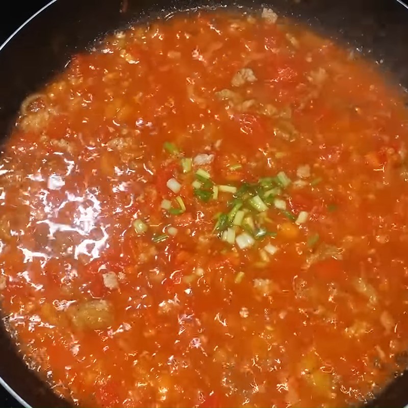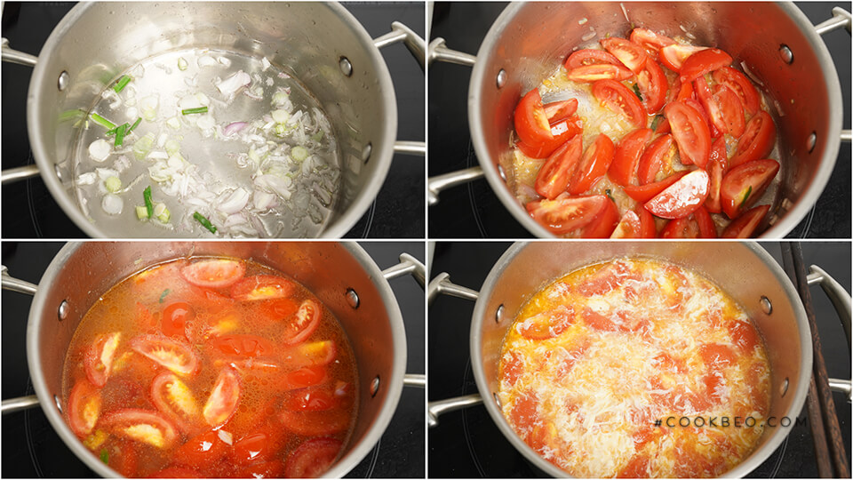 Sau khi đã chuẩn bị đủ nguyên liệu, bạn cho hành tím vào chảo nóng, phi cho thơm. Tiếp đến, thêm cà chua đã cắt vào, đảo đều cho đến khi cà chua chín mềm. Lúc này, bạn có thể cho 1 thìa cà phê nước tương (hoặc nước mắm nếu không ăn chay), 1 thìa cà phê muối vào để gia tăng hương vị.