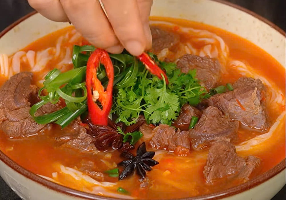 Sau khi đã cho nước dùng vào tô, bạn xếp lên trên một phần thịt bò sốt vang được chế biến từ dẻ sườn hoặc gân bò, vừa mềm ngọt lại có chút giòn giòn. Đừng quên thêm một cọng ngò rí lên giữa tô phở để tăng thêm sức hấp dẫn. Món ăn này không chỉ đơn thuần là phở, mà có thể ăn kèm với bánh mì hay bún, chấm cùng nước mắm pha chế đậm đà và mang lại trải nghiệm ẩm thực khó quên.