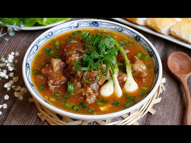 Một kg xương bò sẽ giúp nước dùng thêm phần ngọt thanh, hòa quyện cùng vị thơm của năm lá nguyệt quế và những gia vị như gừng, tỏi, quế, hoa hồi. Đặc biệt, không thể thiếu một chén rượu vang đỏ để tạo nên hương vị đặc trưng cho sốt. Cà chua chín đỏ điểm xuyết cho món ăn thêm màu sắc và sự tươi mát.