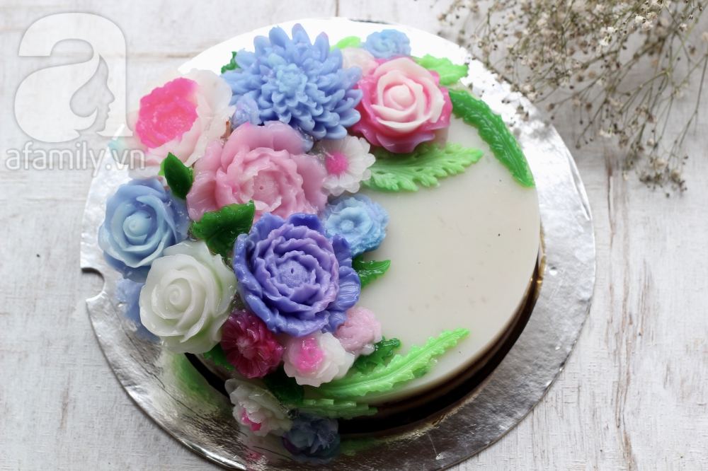 Sau khi nấu xong, múc một phần nước rau câu vào 2/3 chén nhỏ, để sang một bên chờ nguội và đông lại, đây sẽ là đế để cắm hoa nổi. Tiếp theo, bạn lấy khoảng 500ml nước rau câu còn lại, pha màu tùy ý với các loại nước đã chuẩn bị, sau đó đổ vào khuôn silicon để tạo hình cho các hoa. Khi nước nguội bớt, bạn có thể cho các loại hoa vào khuôn, xếp theo sở thích. Đợi cho đến khi mọi thứ đông lại, bạn sẽ có được những ổ bánh rau câu đẹp mắt và hấp dẫn ngay tại nhà.