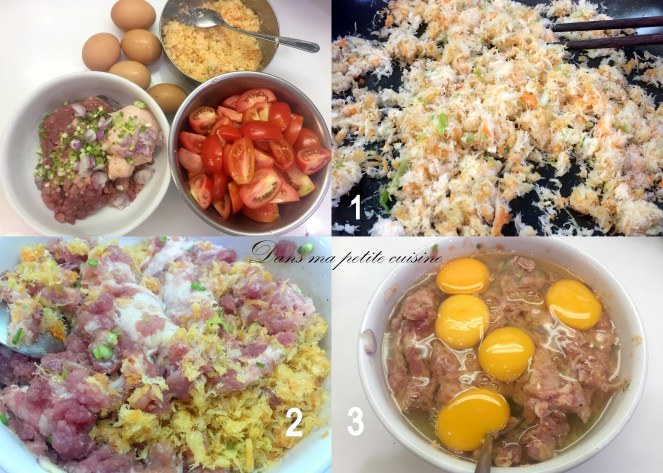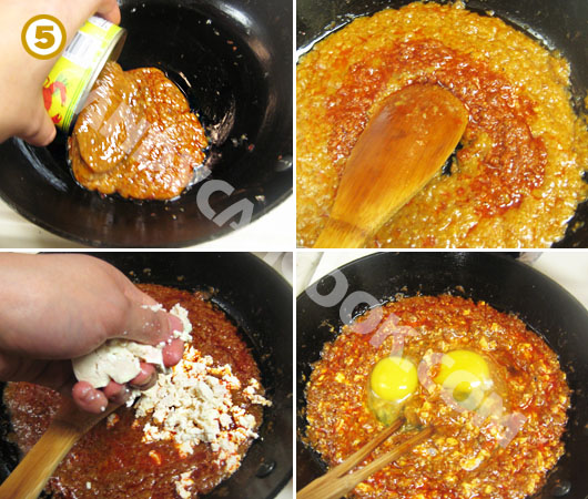 Tiếp theo, bắc chảo lên bếp, cho một muỗng canh dầu ăn vào, phi tỏi băm cho thơm. Khi tỏi đã dậy mùi, bạn cho thịt băm vào chảo, sử dụng đũa hoặc vá dằm tơi thịt ra, đảo đều tay liên tục để thịt chín đều và không bị vón cục. Sau khi thịt đã săn lại, đổ vào chảo hỗn hợp trứng đã đánh tan.