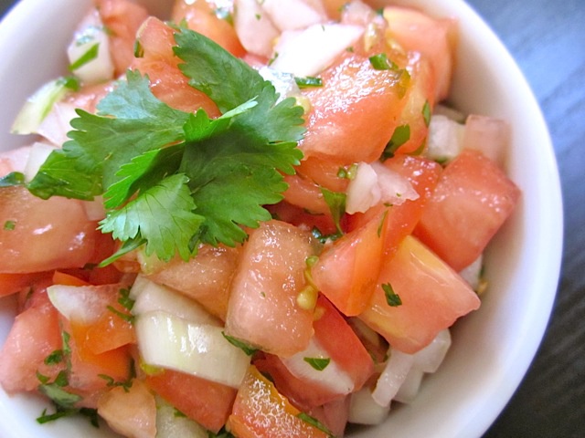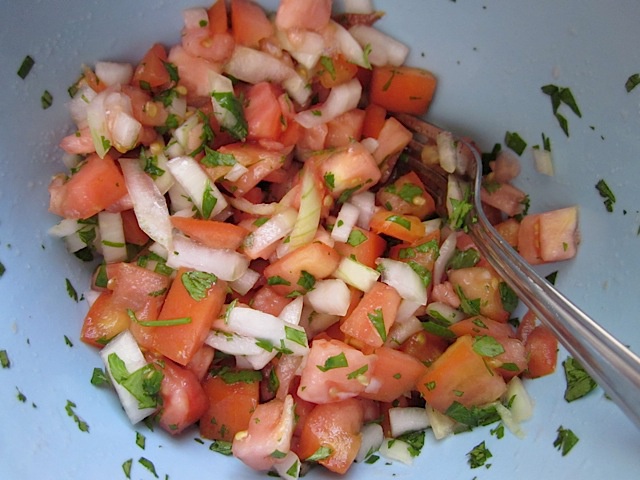 Tiếp theo, cắt cà chua thành những miếng vừa ăn và xắt nhỏ rau ngò. Bạn có thể vắt nước cốt chanh vào chén, thêm chút muối rồi khuấy đều lên. Khi mọi nguyên liệu đã sẵn sàng, hãy cho cà chua, hành tây và rau ngò vào một tô lớn, rồi đổ nước chanh đã chuẩn bị sẵn lên trên.