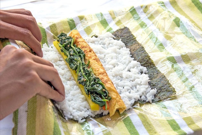 Sau khi đã cho các nguyên liệu vào, bạn cuốn thật chặt tay lại, như vậy món sushi của bạn sẽ hấp dẫn hơn. Nếu bạn thích sự giòn nhẹ, hãy dùng dưa leo thay cho rong biển nori; điều này không chỉ giúp bạn có món sushi độc đáo mà còn mang đến cảm giác mới lạ hơn khi thưởng thức.
