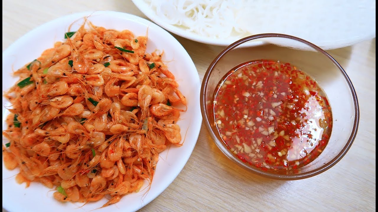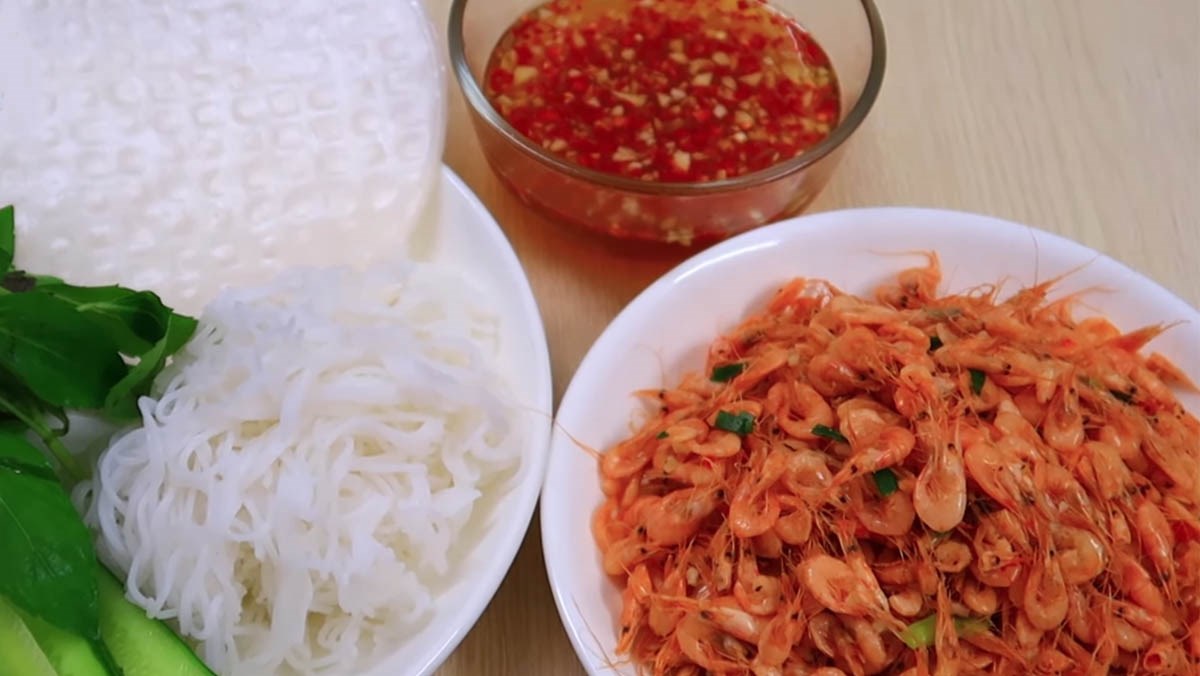 Cuối cùng, bạn chỉ cần lót rau thơm dưới bánh tráng, rải đều tép rang và bún sợi lên trên trước khi cuốn chặt lại. Đừng quên chấm với nước mắm tỏi ớt chua ngọt, món ăn sẽ trở nên tuyệt vời hơn bao giờ hết với vị béo ngọt của tép và độ giòn thơm của rau sống. Món này thật sự là một trải nghiệm tuyệt vời!