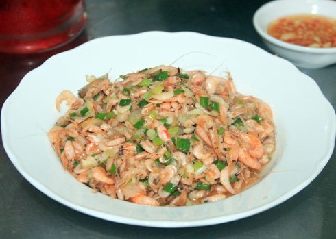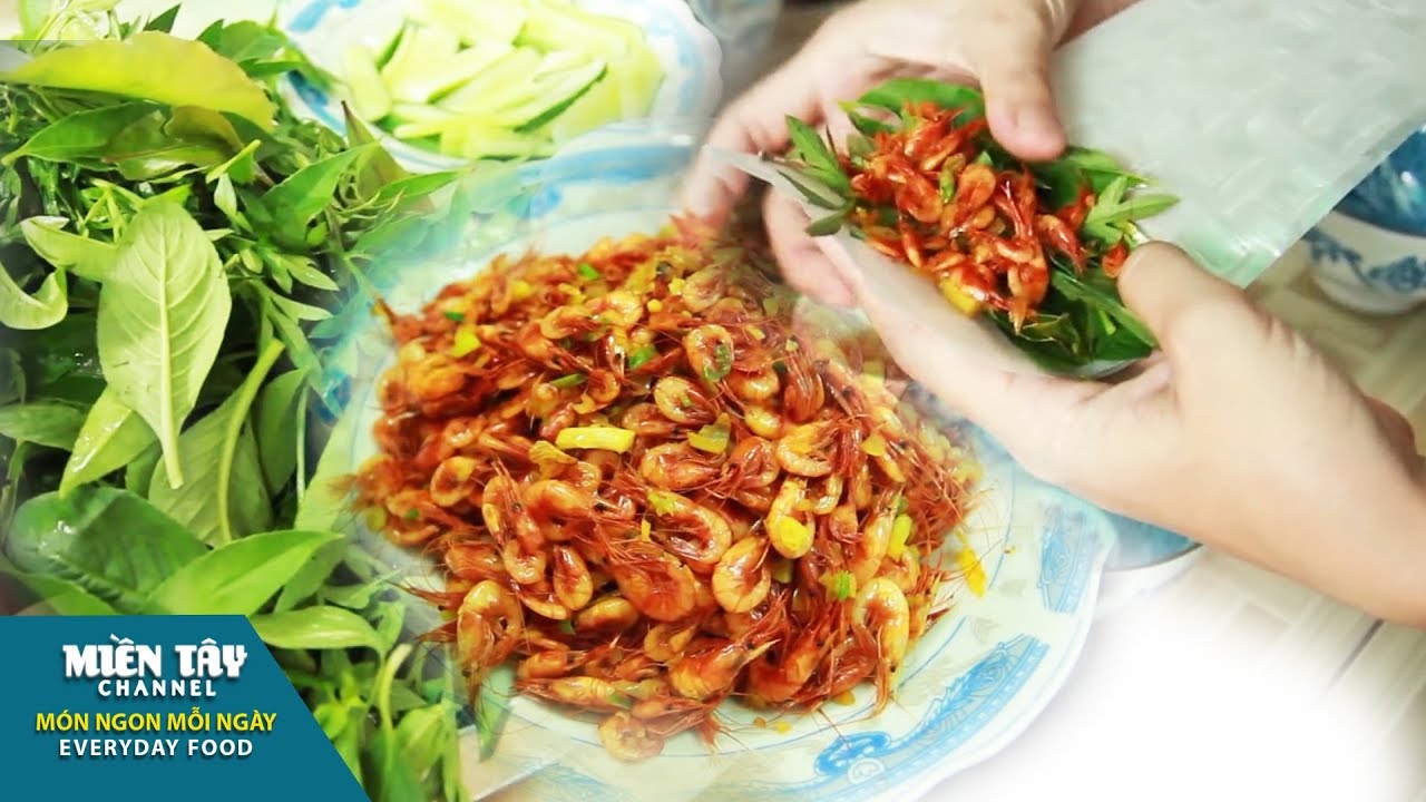Tép um cuốn bánh tráng là món ăn dân dã nhưng lại mang đậm hương vị quê hương. Để làm món này, trước tiên bạn cần rửa sạch tép với nước, sau đó cho vào thau cùng một muỗng canh muối và ba muỗng canh giấm. Dùng tay bóp nhẹ trong khoảng 5 phút rồi rửa sạch lại với nước. Tiếp theo, tép sẽ được rang xóc với ít mỡ nước, có thể thêm khế và lá chanh để dậy hương vị.