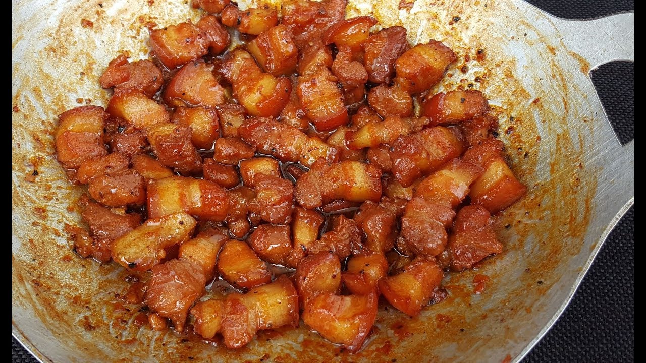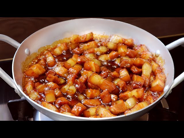 Tiếp đến, nguyên liệu chính để tạo nên hương vị đặc trưng cho món kho quẹt là thịt ba chỉ và tôm khô. Thịt ba chỉ bạn nên chọn loại có tỷ lệ mỡ và nạc hợp lý để món ăn không bị khô. Khi chế biến, thắng đường cho đến khi chuyển sang màu nâu cánh gián, rồi cho thịt vào đảo đều cho đến khi thịt săn lại.