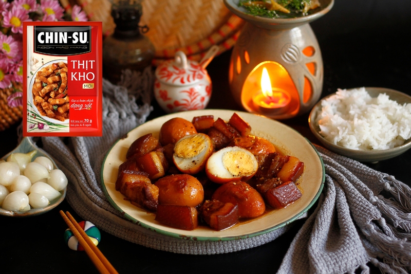 Sau khi thịt đã thấm gia vị, bạn cho thịt vào nồi cùng với tỏi, ớt và hành tím, trộn đều và để khoảng 10 phút nữa. Gói sốt gia vị thịt kho Chinsu sẽ giúp bạn rút ngắn thời gian chế biến nước màu, giúp món ăn thêm đậm đà và hấp dẫn. Cuối cùng, món thịt kho tàu đã sẵn sàng để thưởng thức cùng với cơm nóng và rau sống, chắc chắn sẽ làm cho gia đình bạn yêu thích!