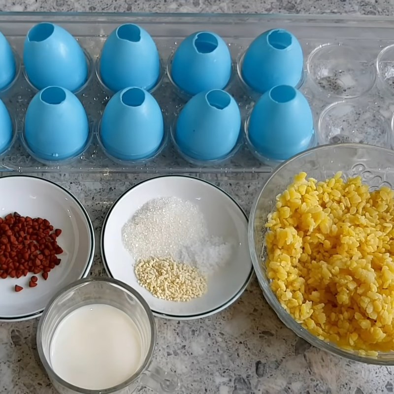 Hôm nay mình xin chia sẻ cách làm lòng đỏ trứng vịt chay rất đơn giản mà lại ngon miệng. Đầu tiên, mình chuẩn bị nguyên liệu gồm 150g đậu xanh, 2g muối, 15g đường và 2 miếng phô mai. Sau đó, mình bắt đầu làm trứng. Đầu tiên, mình khoét một lỗ nhỏ trên quả trứng để lấy lòng trắng ra, vệ sinh trứng thật sạch sẽ.