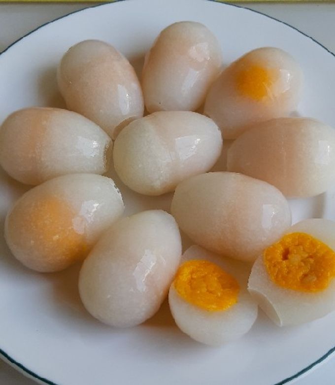 Khi đã lấy hết lòng trắng, mình tiến hành làm tròng đỏ từ đậu xanh. Mình đã nấu một hỗn hợp nước, sữa đậu nành cùng bột rau câu, sau đó đổ vào khuôn để tạo hình. Trong quá trình đó, mình nhớ khuấy đều cho đến khi hỗn hợp sệt lại. Sau khi để nguội, mình cho tròng đỏ vào lòng trắng đã chuẩn bị trước.