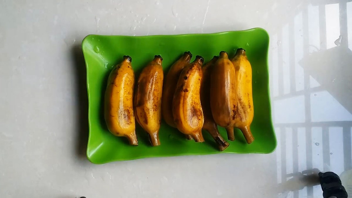 Sau khi nấu chuối được 10 phút, tắt bếp nhưng không vội vàng vớt ra ngay. Hãy để chuối ngâm thêm khoảng 5 phút trong nồi, lúc này vỏ chuối sẽ bắt đầu nứt ra, cho thấy chuối đã chín mềm.