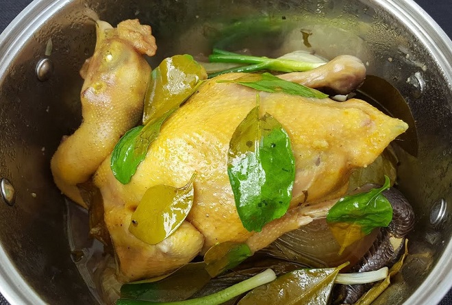 Bước tiếp theo quan trọng là luộc trên lửa nhỏ trong khoảng 50 phút. Hãy kiên nhẫn không mở nắp vung, vì hơi nước sẽ giữ cho thịt gà chín đều mà không mất đi hình dáng. Một mẹo hay là cho thêm vỏ của một loại quả giàu vitamin C vào nồi luộc, sẽ làm cho da gà vàng ươm và giòn ngon hơn.