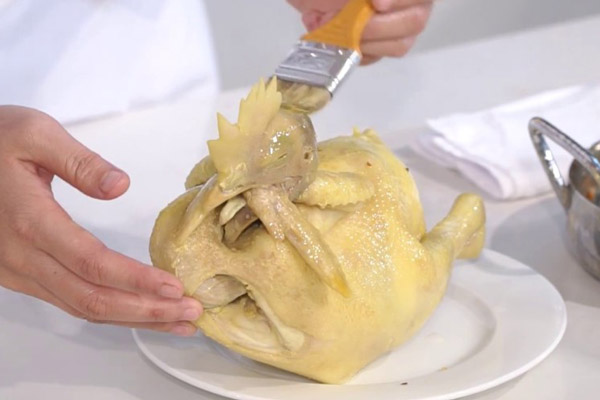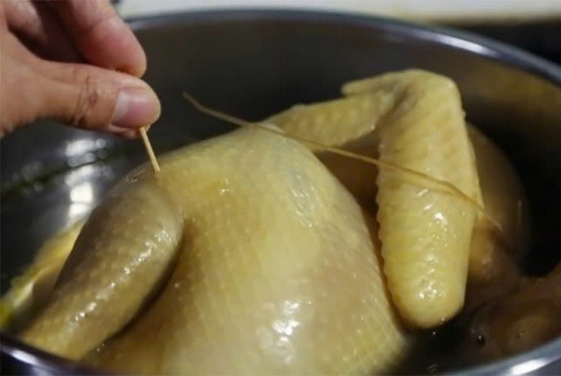 Sau khi vớt gà ra khỏi nồi, đây là bí quyết quan trọng: hãy cho gà vào tô nước lớn với vài viên đá. Điều này giúp da gà giữ được độ dai và bóng bẩy. Ngoài ra, nếu muốn gà không bị nứt da, bạn nên rửa và chà xát nhẹ nhàng, tránh làm lớp da bị mỏng đi. Khi cho gà vào nồi, nhớ để bụng gà hướng xuống dưới và giữ cho huyết trong gà đã chảy hết để tránh tình trạng gà bị đỏ da.